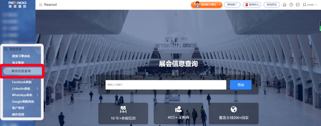 瑞诺国际智能云站管理后台→左侧智能获客→展会信息查询
