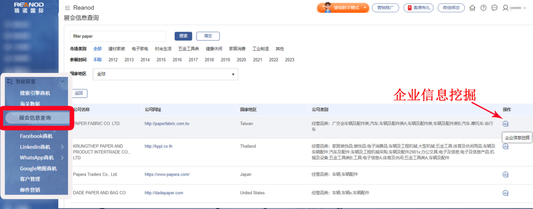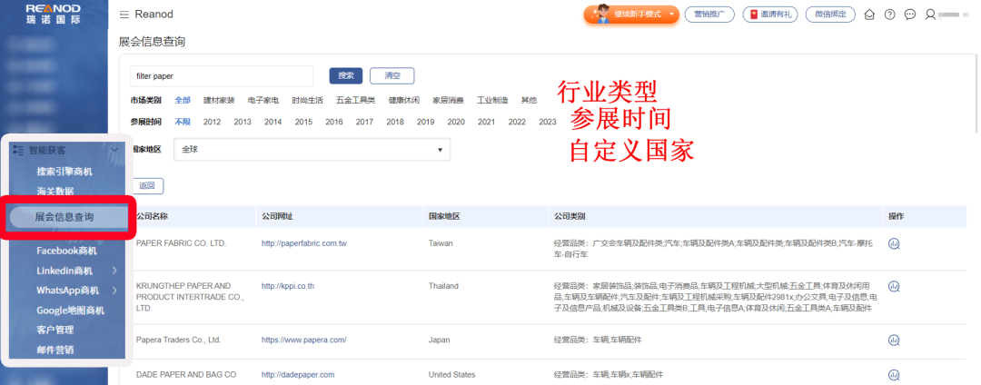 答:登录瑞诺国际智能云站后台,点击左侧【展会信息查询】,输入与您的产品或服务相关的关键词,系统会根据您所输入的关键词自动匹配潜在的客户信息。此外,该功能还支持多维度搜索,包括行业类型、参展时间以及自定义国家,这些精细化的搜索条件可以让您更加精确地定位目标客户群。