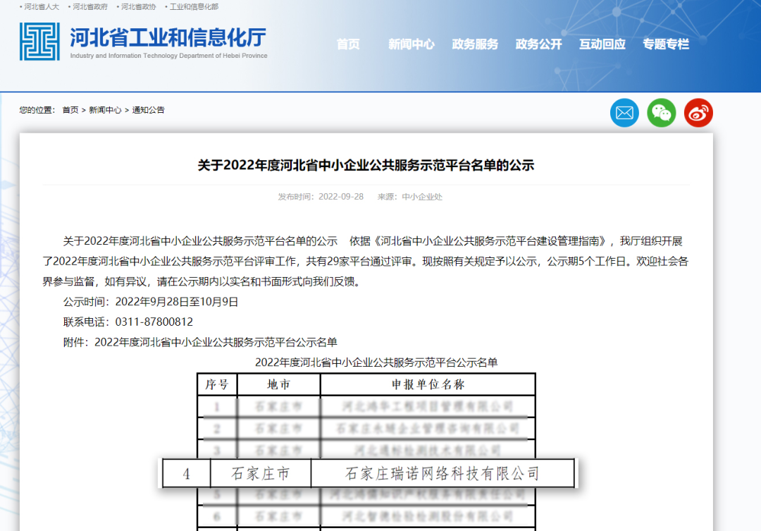 近日,河北省工业和信息化厅正式公布了2022年度河北省中小企业公共服务示范平台名单,石家庄瑞诺网络科技有限公司(以下简称“瑞诺国际”)凭借深耕外贸数字营销领域多年的实践积累、优质的产品和服务成功斩获该项荣誉,再次成为省级示范企业。