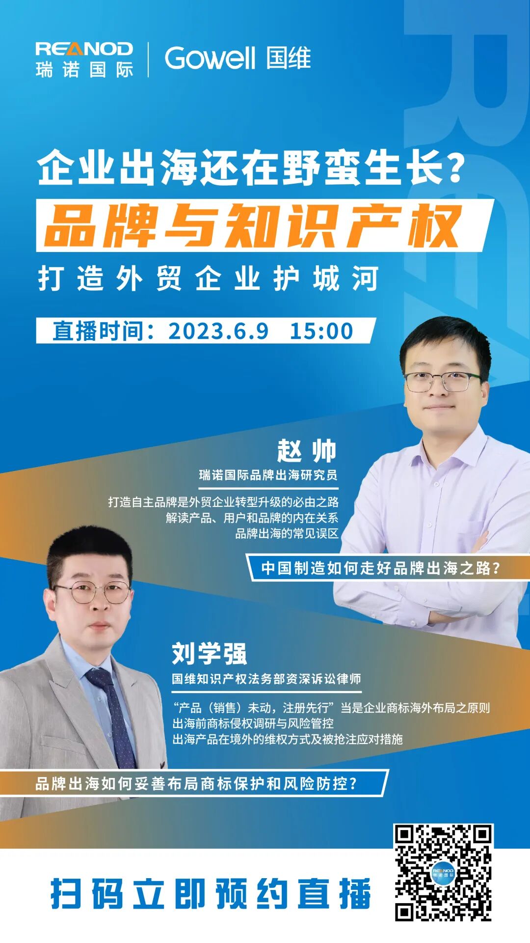赵帅老师将根据其多年的实战经验,分享品牌运营转型策略,让更多企业脱胎换骨,实现跨境发展;而刘学强律师将就知识产权保护进行深度解读,帮助企业构建品牌海外保护体系,规避相关法律风险,确保品牌资产安全。