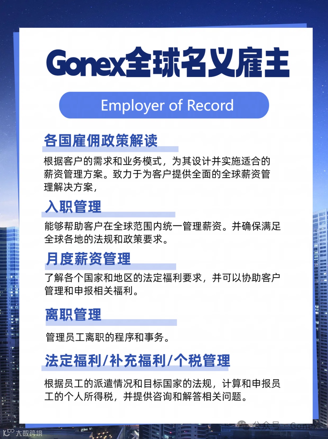降低海外用工成本及风险;提升企业客户海外业务发展及全球员工管理的效率,帮助客户在未建立法律实体的国家或地区合法雇佣员工。Gonex.丰富实践经验的交付团队,助力企业客户合规和高效的管理海外员工。如您的企业有海外雇佣需求,欢迎扫描下方二维码,由专业全球人力资源团队与您对接,免费获得更加贴合企业需求的人力资源解决方案!