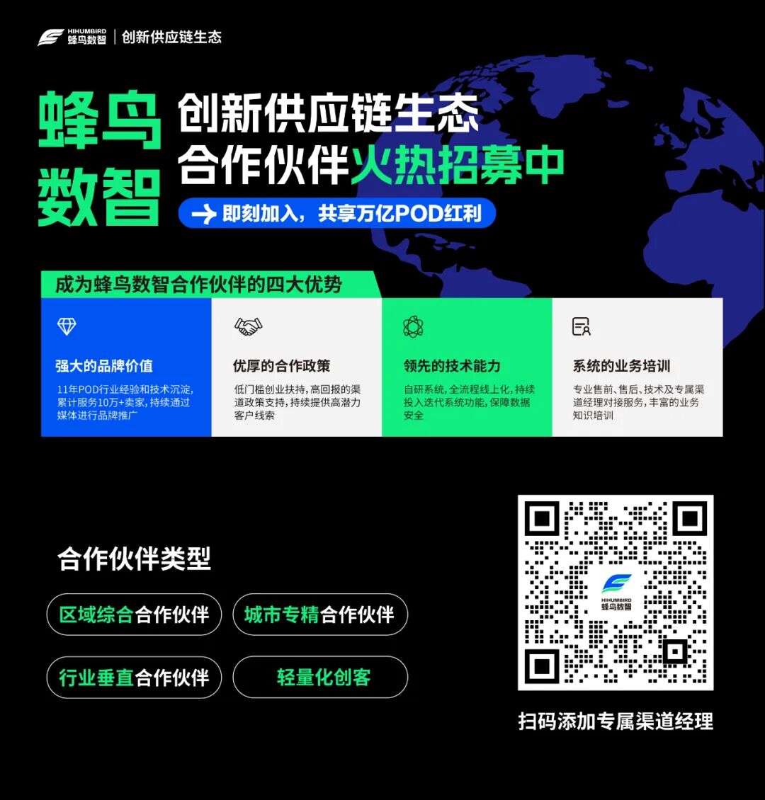 作为指纹科技重点孵化的创新平台,蜂鸟数智不只是一个工具,而是一张庞大而高效的‘地网’——全球POD供应链生态网络,真正意义上打通了供应链的“最后一公里”,将履约体验做到极致。