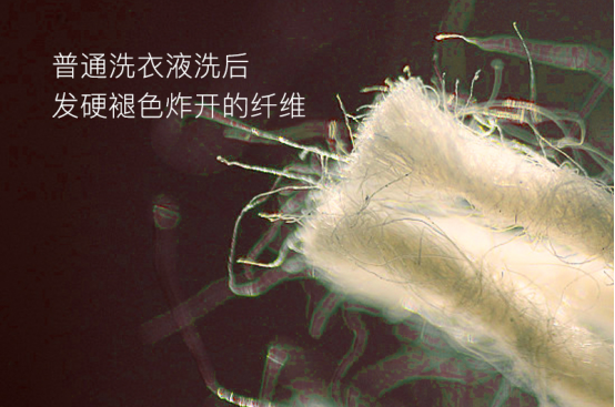 易损纤维需要像头发一样精心护理,穿在身上的羊毛绒等衣物早已离开羊的宿体,没有羊毛脂的滋养,羊毛的鳞片结构会促使纤维产生缩绒,导致衣物洗后缩水变形。除羊毛,丝类、羽绒、兔毛、真丝、皮草都是蛋白质纤维,专门调配营养成分能使衣服更柔软更有光泽,植物蛋白高级棉同理,养护上光的同时还能让衣物柔顺抗硬水。