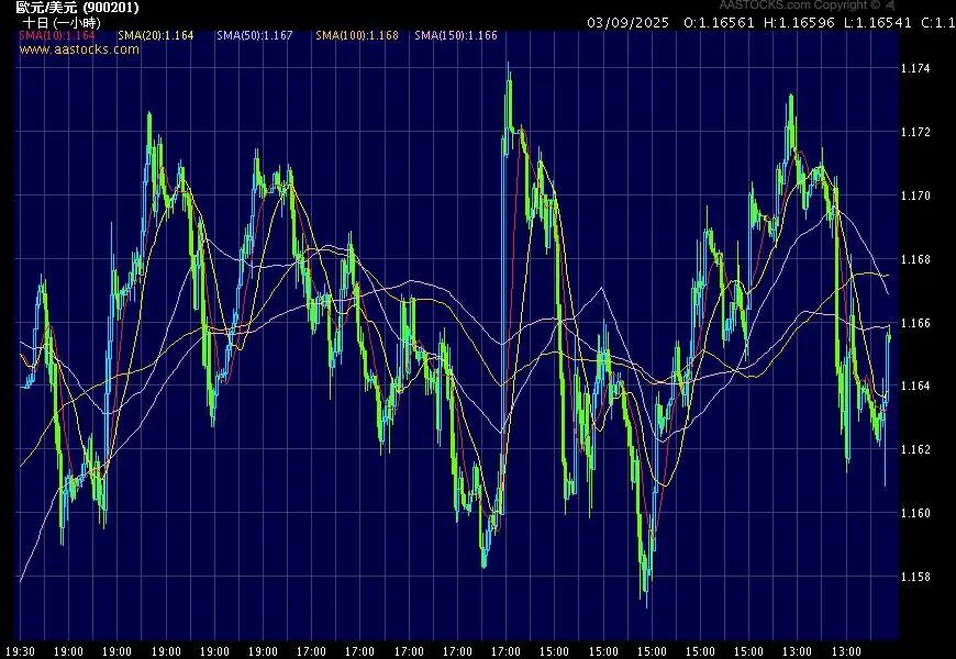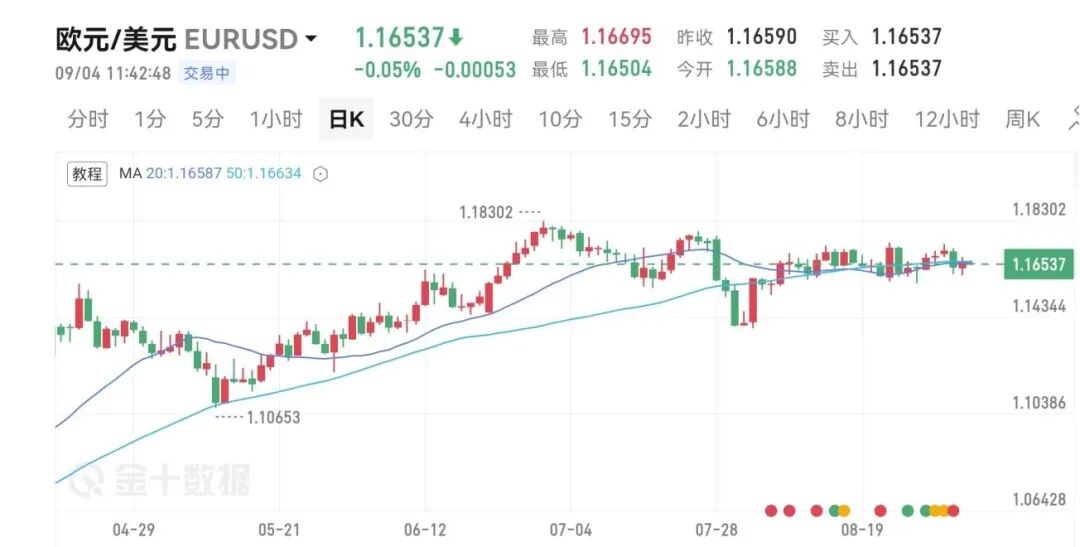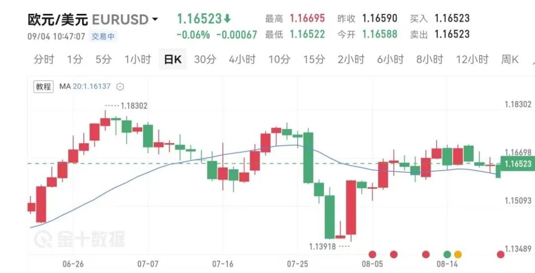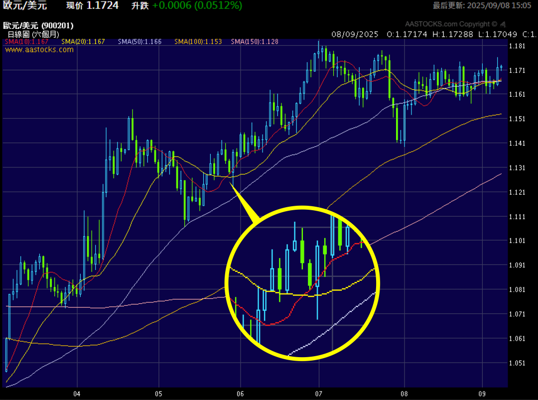 下图为9月4日欧元兑美元的20日移动平均线图。
