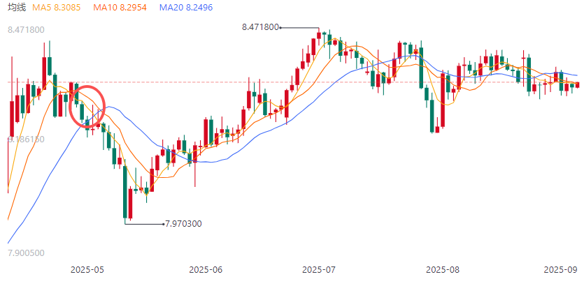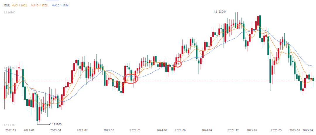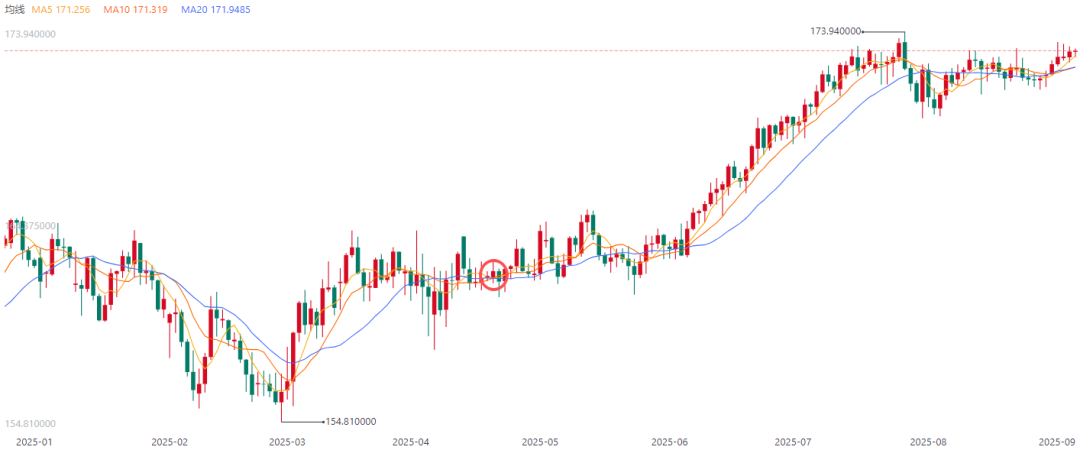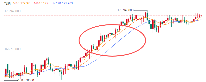当市场维持健康上涨时,均线会像爬坡一样,以一定的角度缓缓向上移动。
