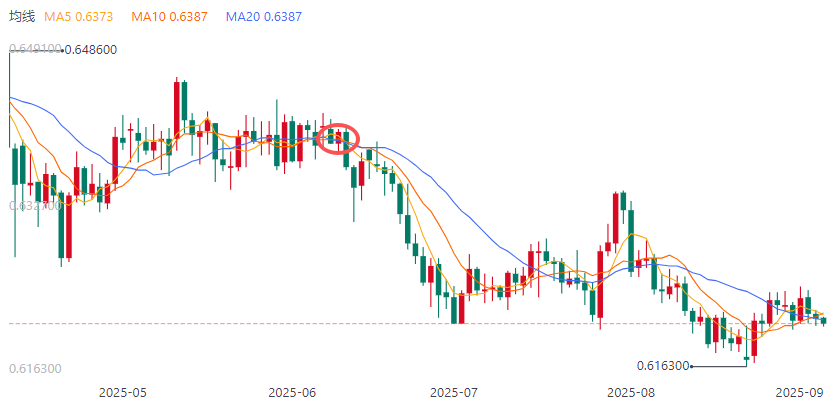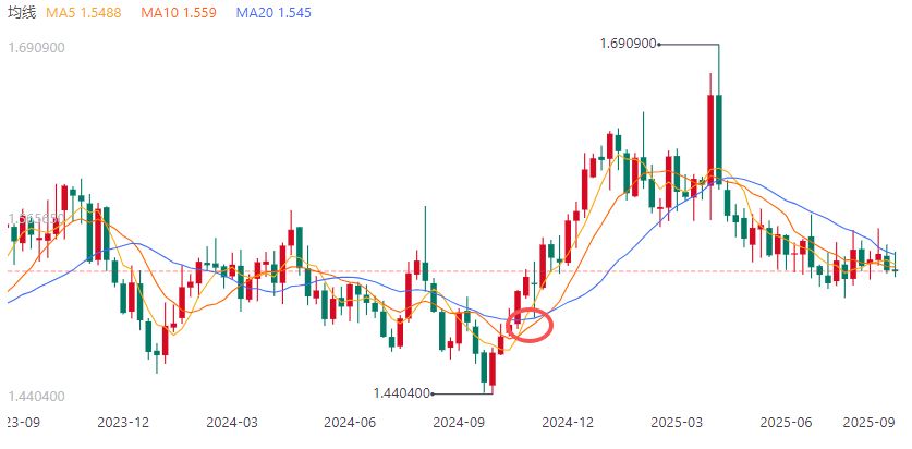 当短期均线自上而下穿越长期均线时,这表明行情可能已经达到顶峰,即将步入弱势甚至发生反转下跌。