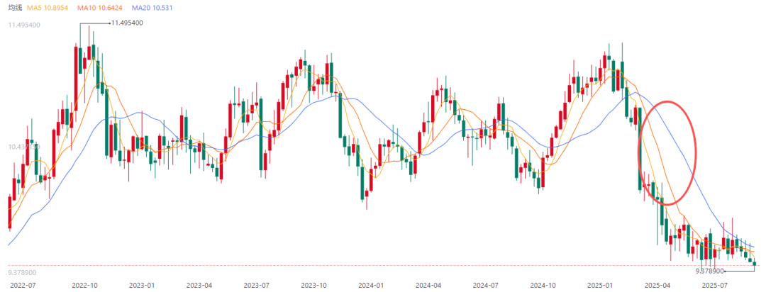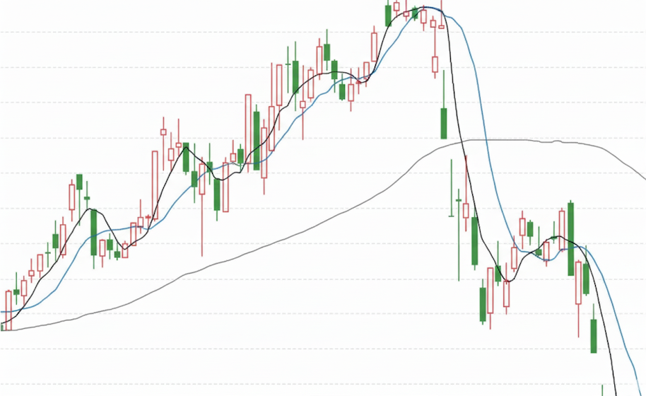 当市场转变为下跌趋势时,均线的排列顺序会完全逆转:短期均线位于最下方,中期和长期均线依次排列在其上方,且整体呈向下运行态势。