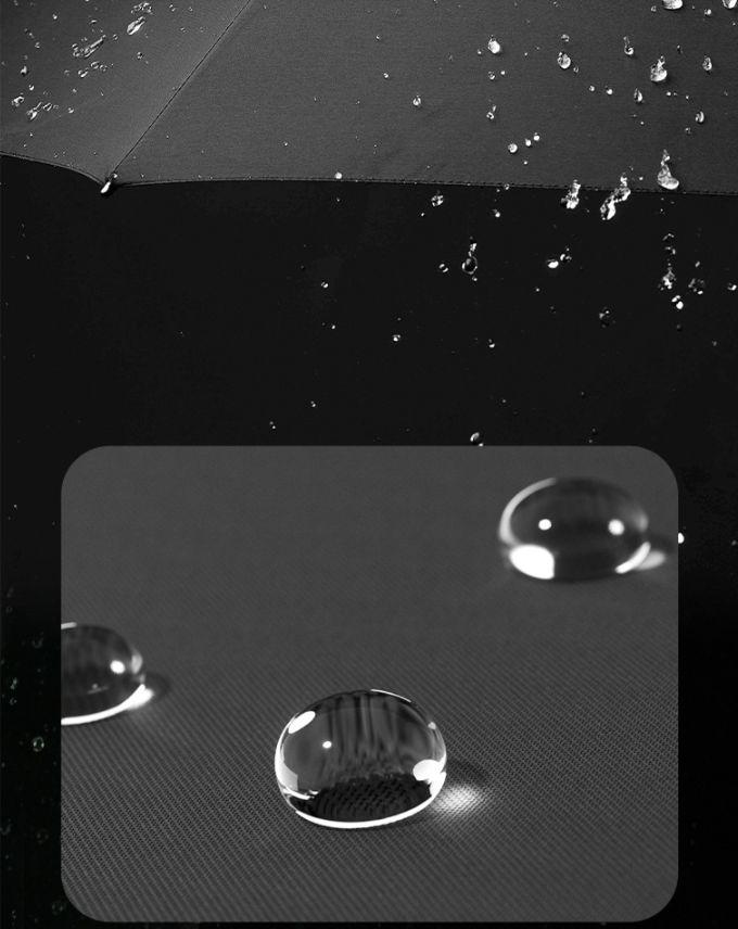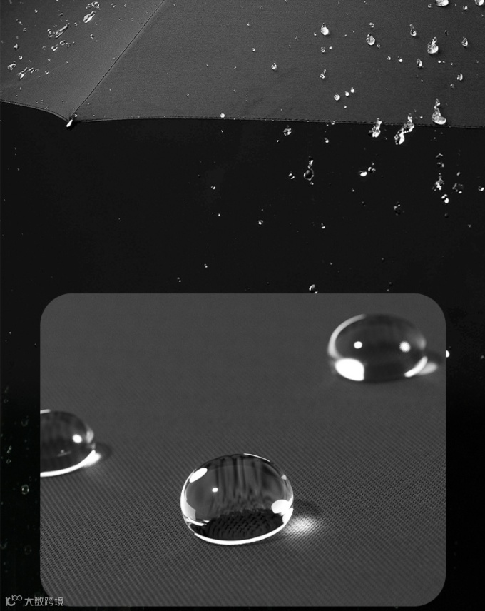 经过特殊工艺处理后,伞布已经形成荷叶疏水效应。再密集的雨滴落下来,碰到伞面也瞬间滑落。