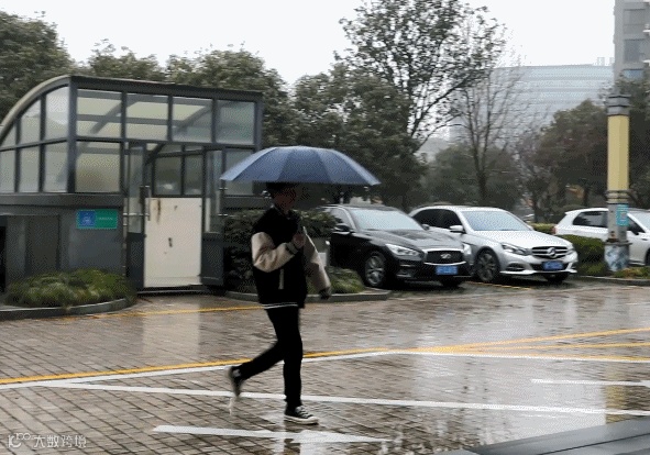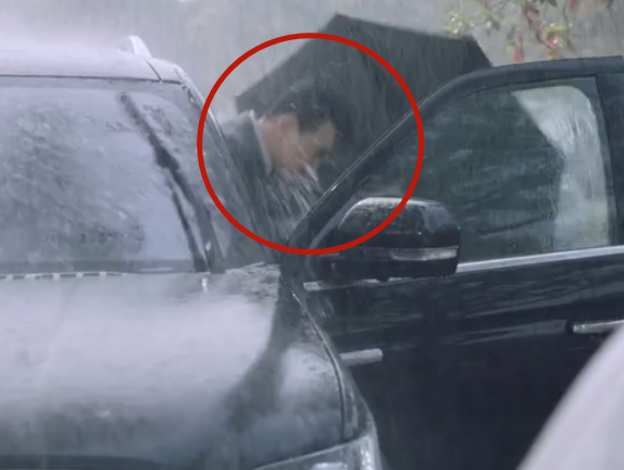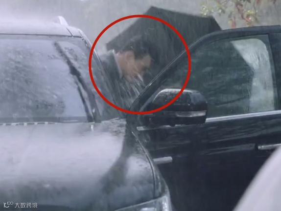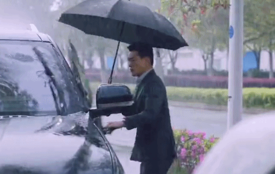 恶劣的天气条件下,西装革履的霸总手持一把黑伞,拉车门→收伞→上车→关车门,一气呵成,一副不惧风雨的形象真是帅气到不行。