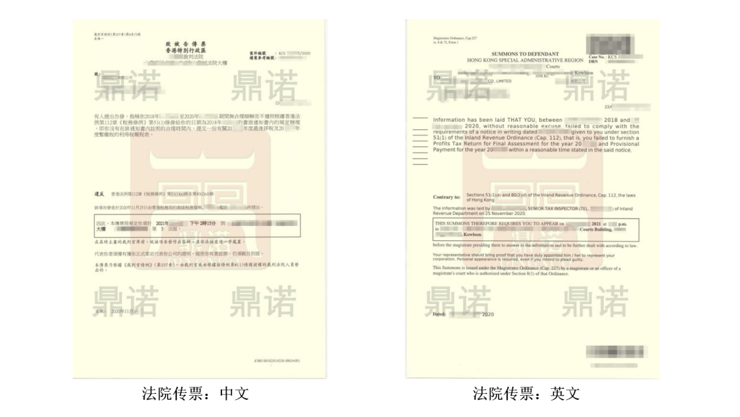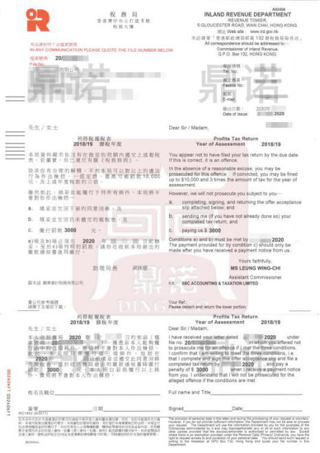 如果收到该罚款单,首先第一时间应该尽快填妥并附加豁免利得税罚款申请,另外需调领未申报年度的利得税税表填报,一并递交香港税务局即可。但是在这个过程中,Ashley说并未收到任何相关通知,鼎诺业务经理只能怀疑是该香港秘书服务公司并未及时收到信件并通知客户处理,导致今次的香港法院传票。