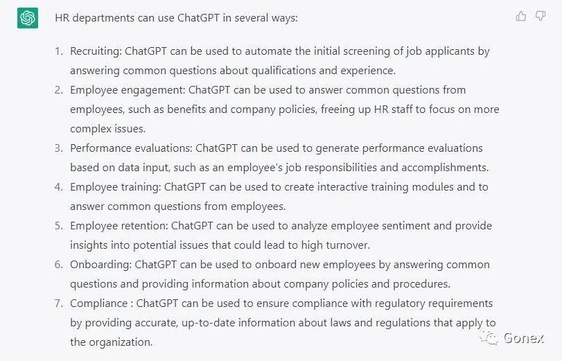 让我们先问问聊天机器人本身。Gonex问ChatGPT,“人力资源如何使用ChatGPT?”。