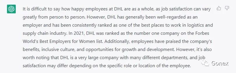 以DHL为例,因为它被《财富》杂志评为2021最佳工作场所,Gonex询问ChatGPT DHL员工是否满意。它回答说: