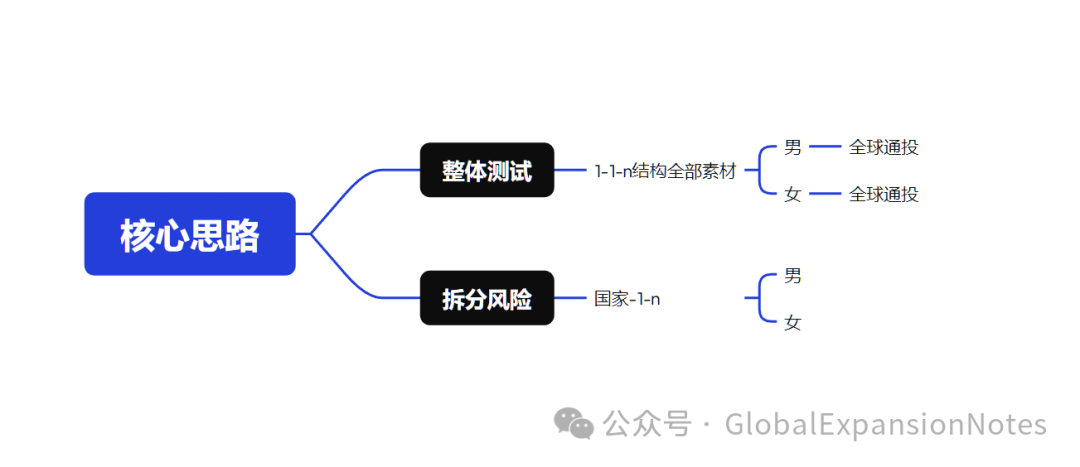 ,并用1-1-n的结构,男女各一个系列,用相同素材、英语、通投全球国家,如果先前测试并筛选出过ROI长期很差的国家,可直接排除;