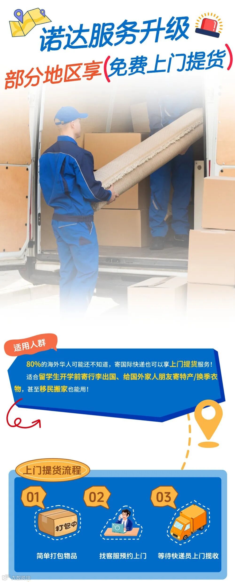 为了方便广东省、广西省、福建省、浙江省、江苏省、安徽省、江西省、山东省、山西省、湖南省、湖北省、河南省、河北省、海南省、上海市、北京市、天津市、四川省、重庆市地区的用户邮寄国际快递出国更便捷,更省钱,更省力,更高效,诺达将提供50或100kg以上的免费上门提货服务!