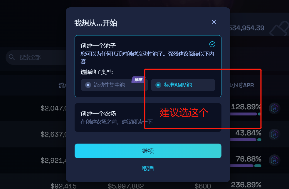 再来看看AMM和CLMM。不管是V2还是V3,在做池子的时候都有这两个选项:AMM就是我们通常理解的资金池,也叫标准池。CLMM类似于Uniswap V3的版本,也叫集中池。该类资金池需要你自己设定价格范围,一旦设定好,超过价格范围就不能交易了。所以这种池子,狗都不做,基本上做项目的也没人会去做CLMM池。