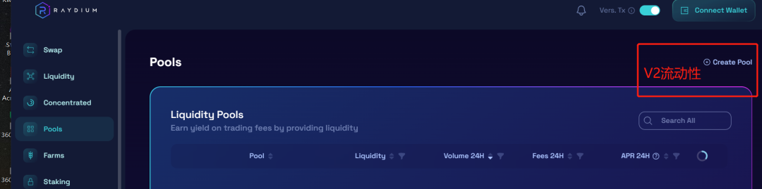 先说V2和V3,V3是Raydium刚刚推出的一个新的UI页面和流动性方式,只要你打开Raydium的官网,默认就是V3的。V3的好处是创建池子不需要做ID,可以直接做。确点是池子不稳定,交易不稳定,行情可能不显示。因此,我们当下还是建议你去V2做池子比较稳妥。