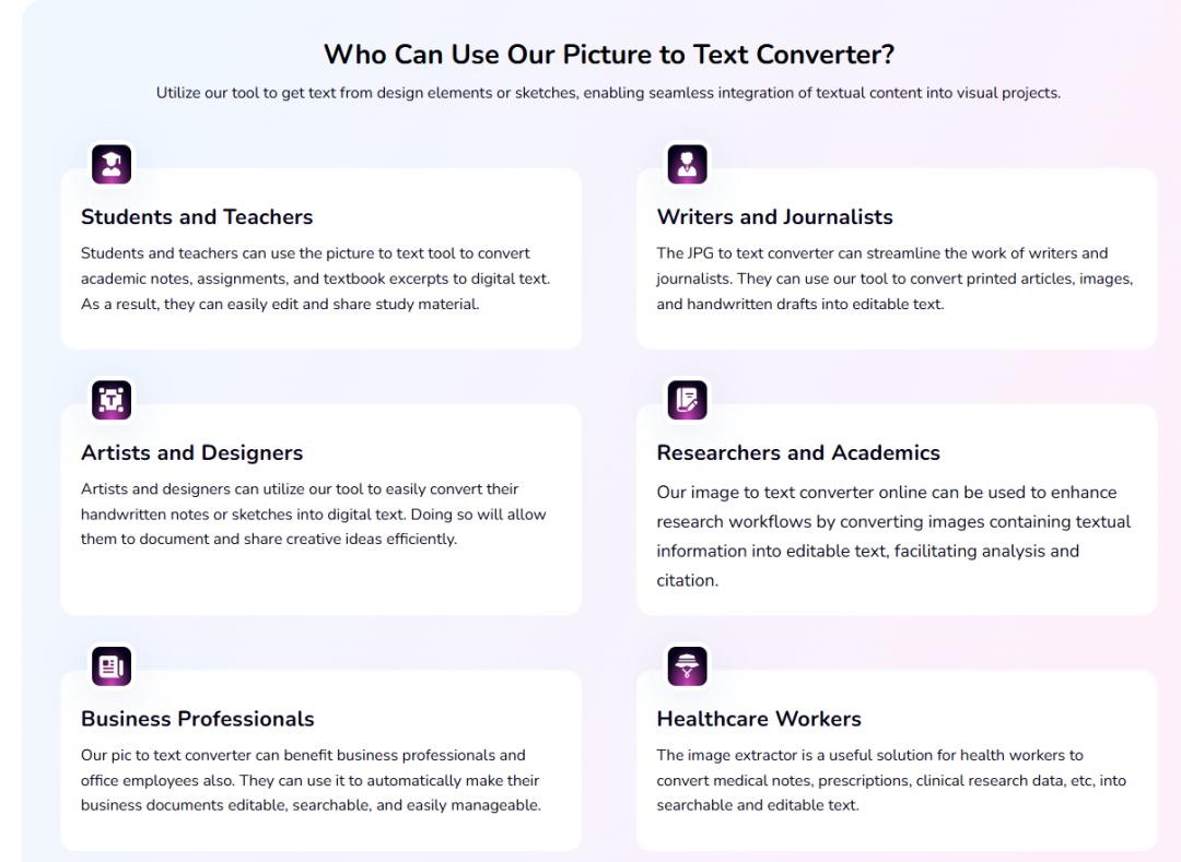 再接下来是使用场景和用户部分,它这部分做的特别详细,不仅详细列出了使用场景,还列出了它覆盖的六类目标用户:学生教师、艺术家设计师、商务人士、作家记者、研究人员和医护人员。我们平时有可能会忽略场景和用户,觉得加上这些意义不大,但是加上场景和用户之后,会代入用户的视角,让他们觉得这个工具对自己是有用的,不仅拉进了用户和工具的位置,用户不再觉得这是一个冷冰冰的工具,而是一个能直接解决他当下具体问题的贴心方案,也更有利于提高转化率。