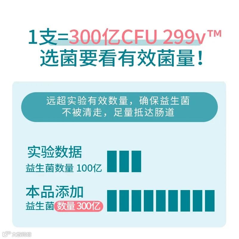 299V™植物乳杆菌的临床有效量是100亿CFU,这款益生菌每一小条都添加了300亿CFU。