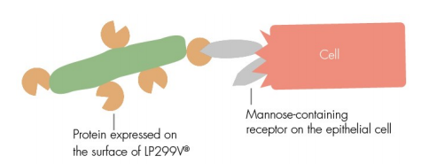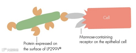 到达肠道后,299V™植物乳杆菌便迅速和肠道上皮细胞的甘露糖紧密结合,在肠道外层形成铜墙铁壁般的铠甲,“挤走”有害菌。