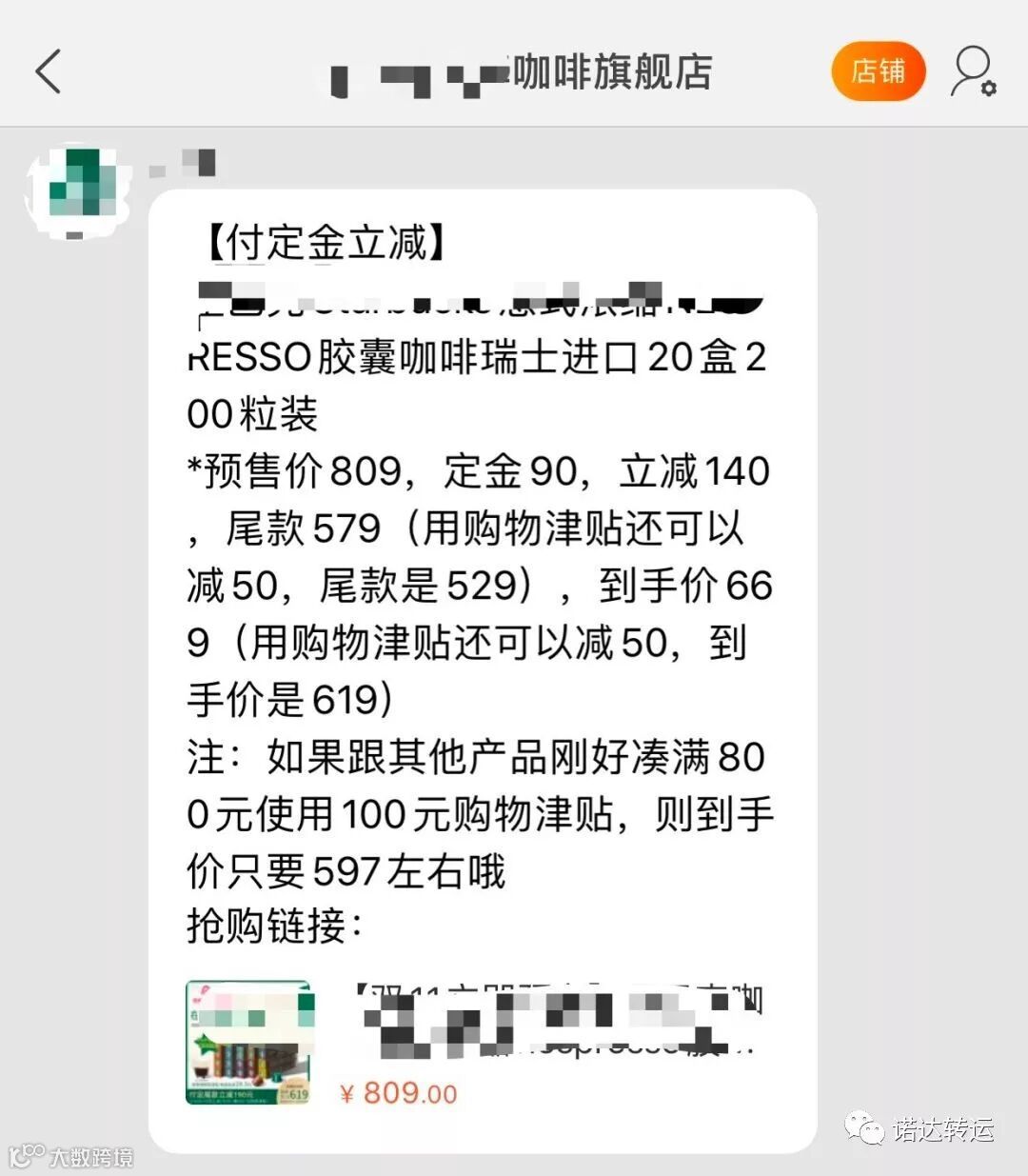 某咖啡预售价809,定金90,立减140,用购物津贴还可以减50尾款,刚好又和其他产品刚好凑满800元了,还可以选择使用100元购物津贴,该商品到手价是多少钱?