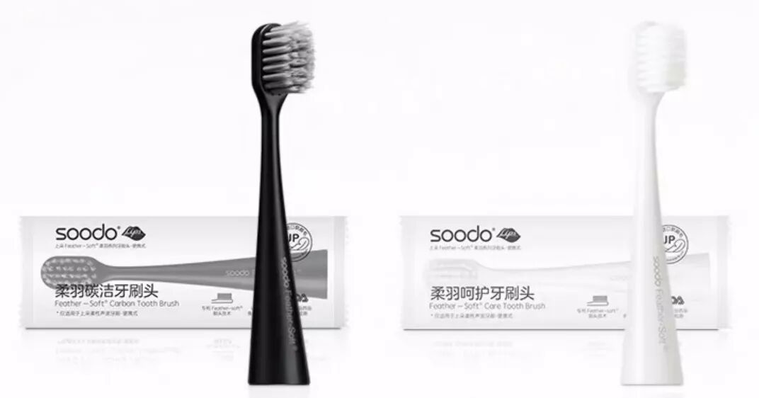 这只牙刷采用了上朵专利的 Feather-soft 柔羽刷头技术和日本进口超软细毛。
