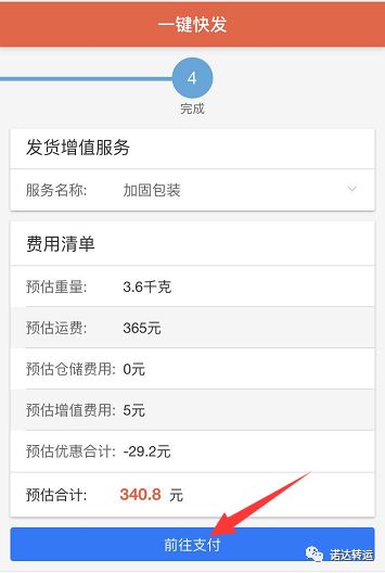 3. 点击一键快发,进入一键快发页面,依次通过向右侧滑屏幕一步一步编辑收货人信息、选择转运渠道、选择增值服务后,来到完成页面。确认费用清单等项目无误后,点击底部“前往支付”按钮进入支付页面。