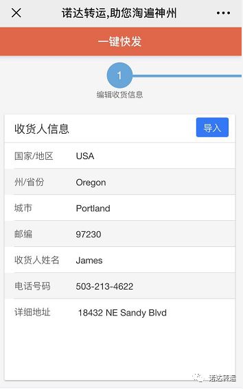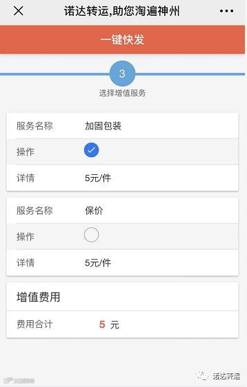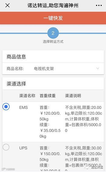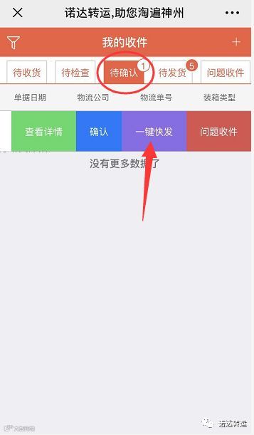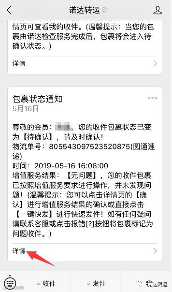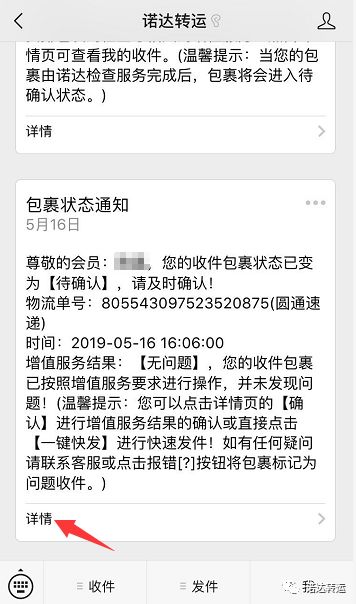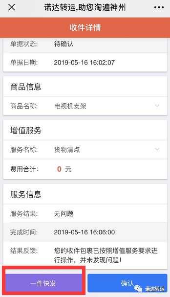 1. 在诺达转运服务号中收到待确认消息后,可以通过点击消息的详情链接,跳转到包裹详情页,在包裹详情页底部有“一键快发”按钮。
