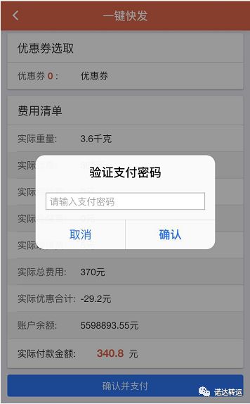 4. 在支付页面核对相关信息后点击底部“确认并支付”按钮,并输入正确的支付密码(注:新注册用户默认支付密码等于登陆密码,需自行进行修改,否则无法完成支付!)后完成一键快发流程。之后在“我的收件”—“待备货”页面可以找到刚才创建的发件包裹,等诺达备货完成并寄出后,包裹将会很快到达收件人的手中!