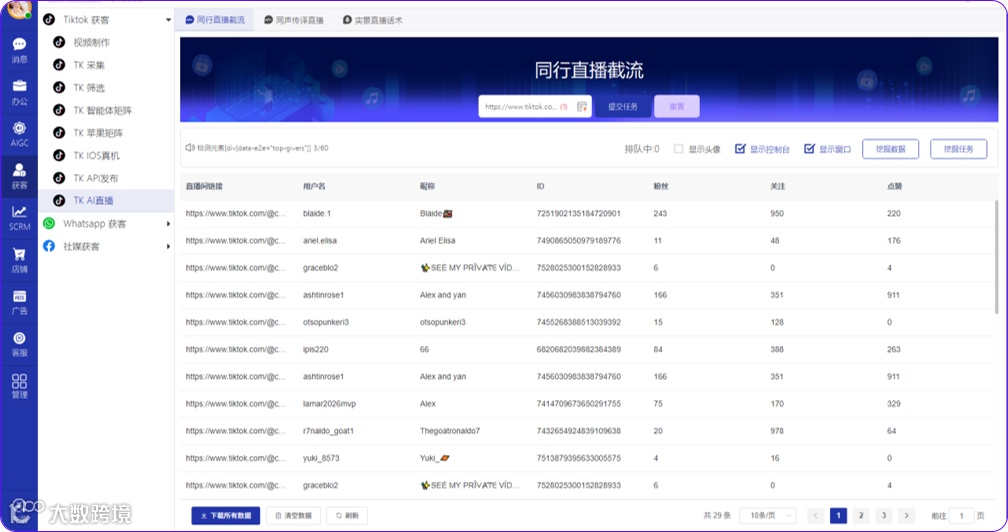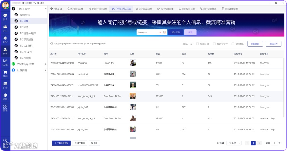 通过关键词、地区、直播间、同行粉丝、账号主页等多维度,撒网式扫描目标用户和同行粉丝池,挖掘潜在自己的潜在客户。