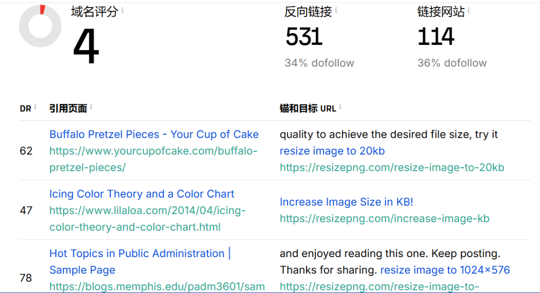 这个站是2023年8月20号上站,差不多两年零2个月,每月流量快12万,差不多一天4000的用户访问,用户停留时间是1分7秒,可以看到最近几个月流量一直是持续上涨的,它做了两年多是不是发了很多外链呢?我们再来看一下它的外链情况: