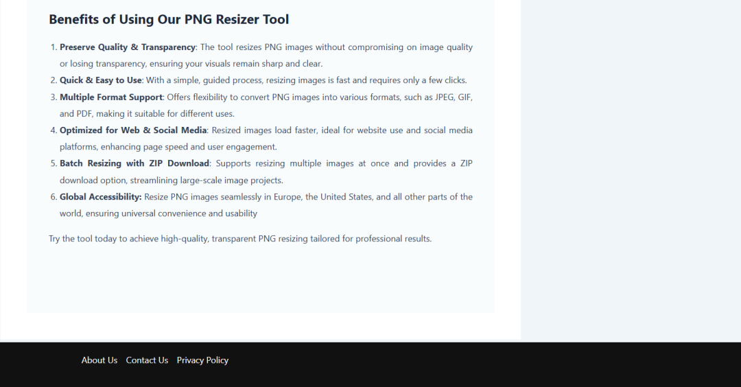 这个布局感觉像是十年前的网站,首屏除了导航部分就直接是Hero部分,然后Hero部分做的也是简单粗暴,直接告诉用户是无损压缩,然后用法也相当简单,只要上传图片,而且填上想要的图片宽度和高度,选择图片格式就可以了,这是典型的把简单留给用户,把复杂留给自已的模式。大家都知道,用户多一个点击就有流失的可能,所以要尽可能的优化使用流程,让用户在最短的时间内达到想要的效果。右边除了站内搜索,还加了一些常用工具的链接。
