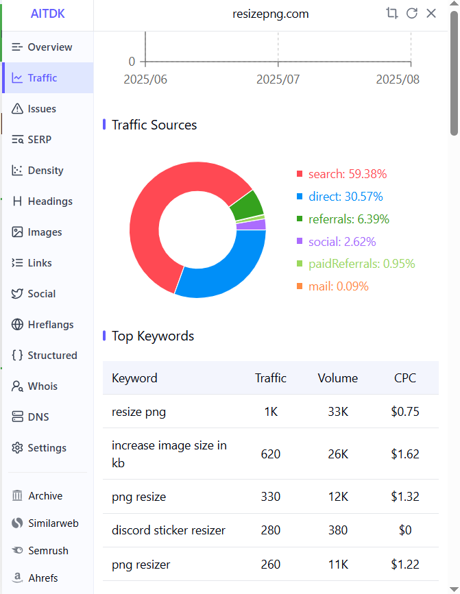 看到这里,我想大家应该明白了,原来它还找了很多的细分长尾词,而且每个还都做了落地页,比如“512×512 Resizer”, “300×300 Resizer”等具体尺寸,这是一个非常聪明的站长。它直接捕获了像 “512x512 png resizer”, “resize image to 300x300” 这类具有极高转化率的长尾搜索。