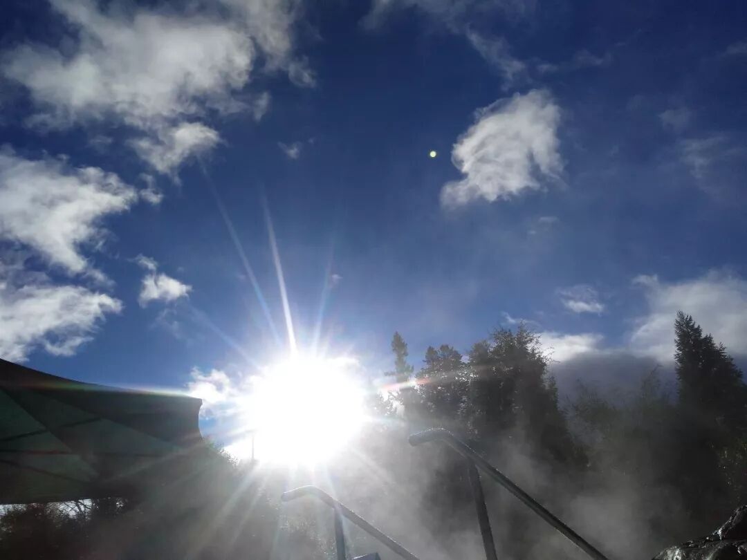 我们去的那天阴天,泡着泡着突然下起了雨,大家都躲进了棚子里,而我任由『冷冷的冰雨在脸上胡乱的拍』,没一会儿,太阳又从云里钻了出来,温泉的水雾在阳光的折射下被风吹得四散开来。来泡温泉的很多都是白发苍苍的老年夫妇,让我恍惚觉得自己也是来疗养的退休人员。