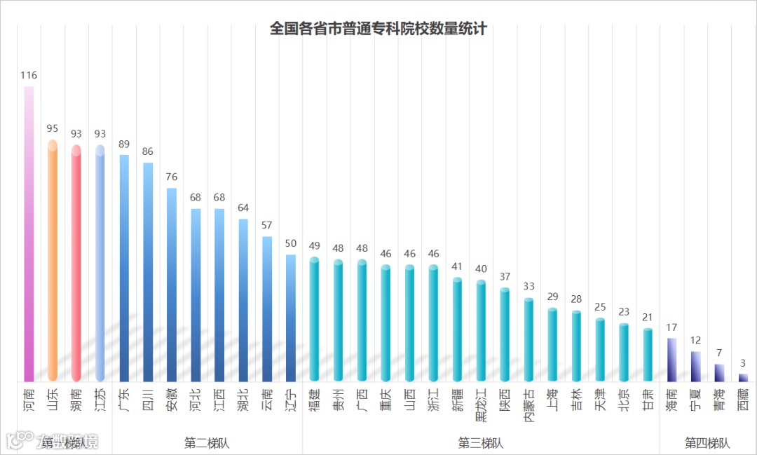 按省份划分,河南以116所高职院校高居首位,其后依次是山东(95所)、湖南(93所)、江苏(93所),构成“第一梯队”。其中,河南作为人口大省,不仅在总量上领先(超出第二名山东21所),其结构也呈现“公办主导(77所,占比66.4%)+民办补充(38所)”的多元特征,并拥有1所中外合作院校。