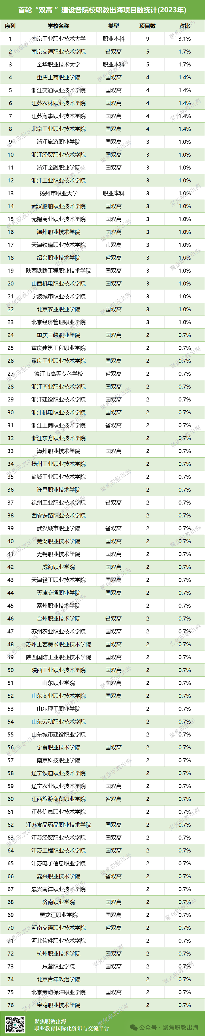 综上所述,首轮“双高计划”建设期间,我国职业院校随企出海项目取得了显著成效。这些项目的成功实施,不仅提升了我国职业教育的国际化水平,还为我国职业教育品牌在国际上的传播和推广奠定了坚实基础。未来,随着“双高计划”的深入推进,我国职业教育国际化进程将进一步加快,更多职业院校将走向世界舞台,为构建人类命运共同体贡献中国职教力量。