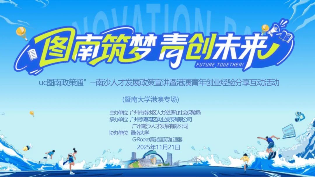 11月21日,由南沙区人力资源和社会保障局主办、G-Rocket高诺国际加速器协办的“图南筑梦·青创未来”系列活动之南沙人才发展政策宣讲暨港澳青年创业经验分享互动活动(暨南大学港澳专场)在暨南大学广州石牌校区精彩举行。这场专为港澳学子量身打造的活动,以政策解读为核心、创业分享为纽带、非遗互动为亮点,逾50名暨南大学港澳学生团成员及有志于湾区发展的大学生齐聚一堂,在干货满满的政策宣讲和非遗文化沉浸式体验中,进一步读懂南沙机遇、增强扎根信心。