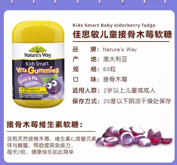 佳思敏儿童感冒和流感免疫型复合维生素富含丰富的接骨木梅和维他命C,可以帮助宝宝支撑一个健康的免疫系统。