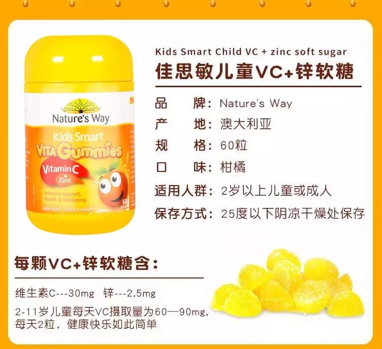 柑橘口味的维他命C+锌的配方,小朋友超爱。维他命C,一种强有力的抗氧化因子能保护机体免于日常辐射的伤害。加上人类不可缺少的矿物质锌,此款软糖能帮助小朋友增强免疫系统,增强抵抗力,预防感冒。