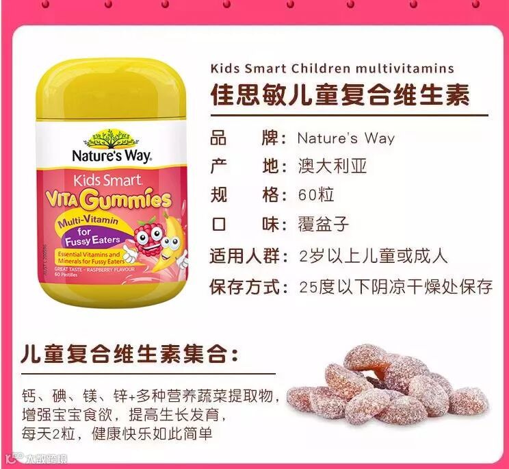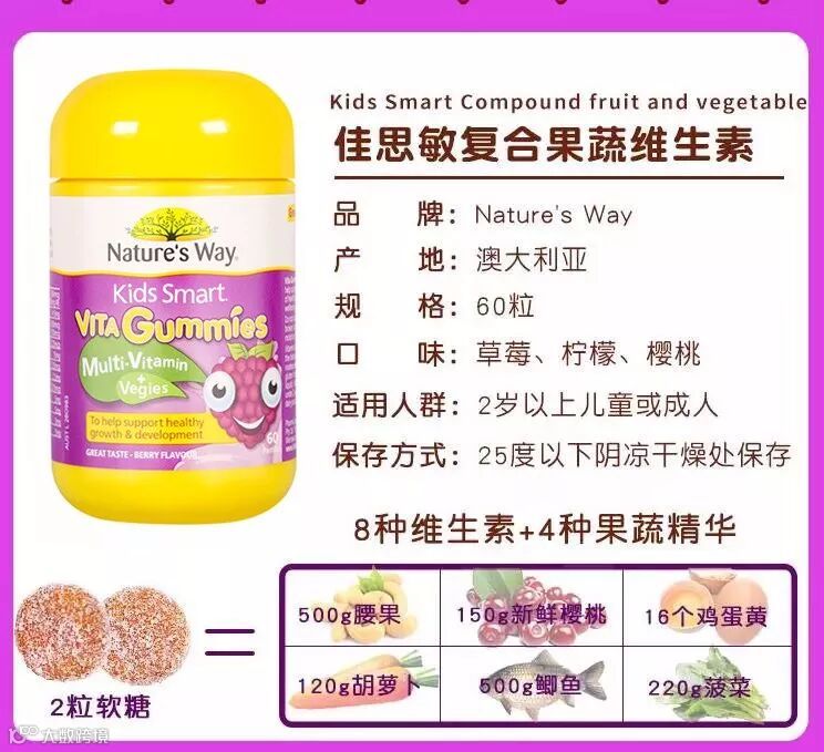 很多宝宝有挑食的毛病,尤其不喜欢蔬菜,容易缺乏成长所需的维生素。Nature’s Way 佳思敏多维果汁软糖含有9种重要维生素及几种蔬菜萃取精华,能为孩子补充所缺的维生素,均衡营养,有助增强体质。