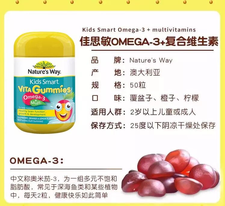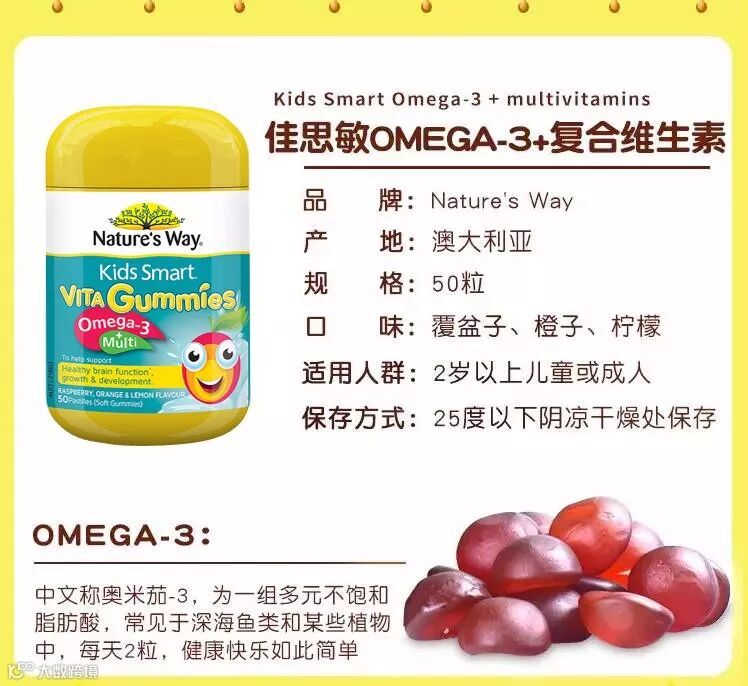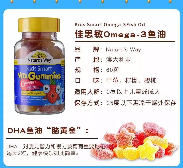 趣味造型清香的水果味道,宝宝都喜欢吃...既补充了鱼油DHA,又可以当作零食食用,当然一天只能吃两粒。专门为儿童设计的深海鱼油配方产品,含有儿童所需的Omega-3.缺乏Omega-3可能产生学习,记忆,视力和行为举动方面的问题。这个产品可以促进脑部发育并有助于提高儿童的记忆力,行为举动,读写能力,对学习不集中等问题有明显的帮助。但有时让孩子吃鱼却成了一项艰难的任务。感谢新一代的佳思敏儿童营养产品让宝宝喜欢,让鱼油的补充可以如此充满乐趣,水果口味,含丰富Omega-3,无鱼腥味,而且不黏牙。