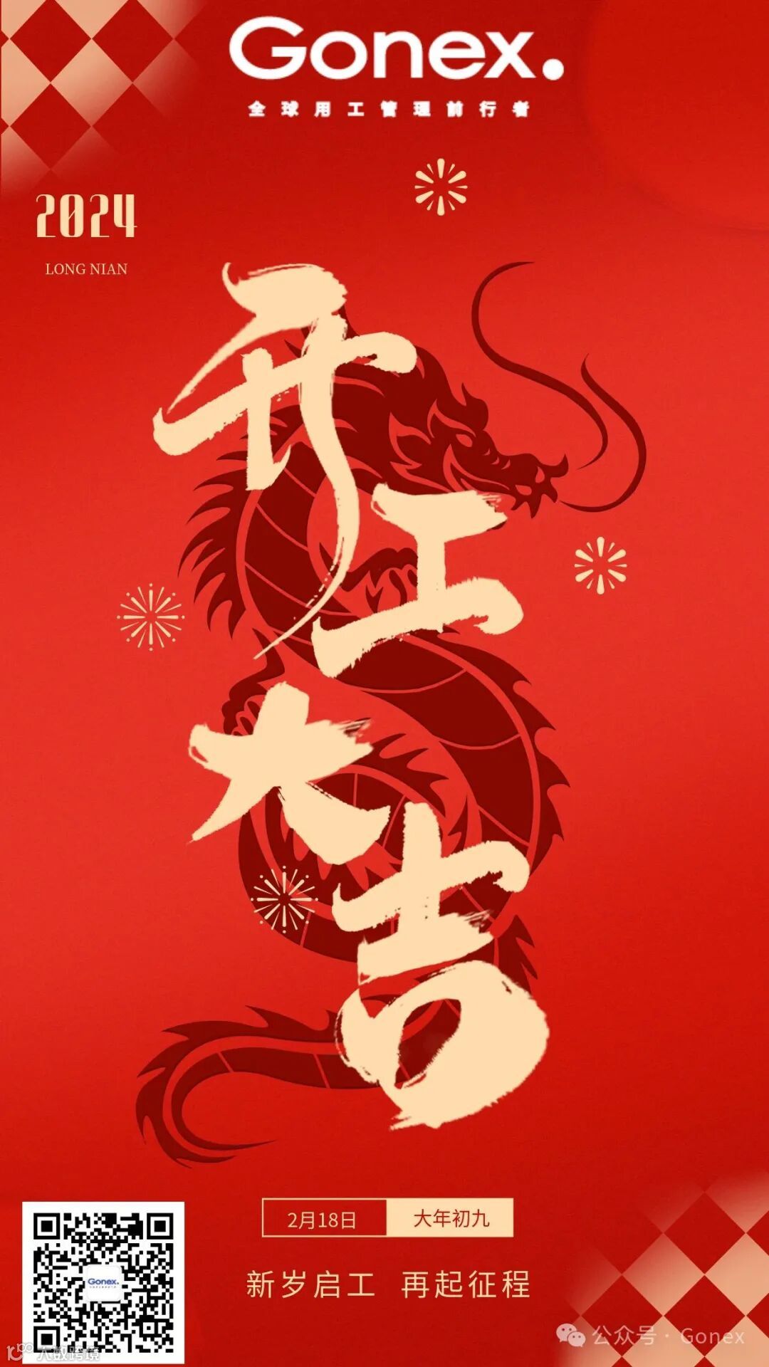 春节的喜庆和团聚已然成为美好的回忆,现在我们迎来了新的征程。在这开工之际,GONEX全体员工向您致以最诚挚的祝福,愿您新的一年开工大吉,事业如龙般腾飞!