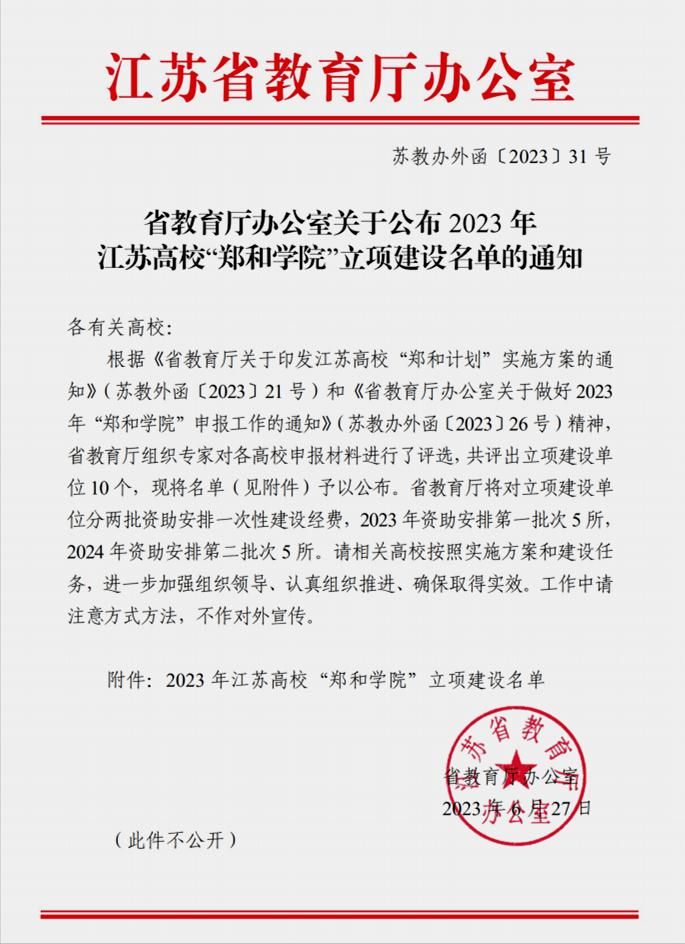 郑和学院:学校与乌兹别克斯坦撒马尔罕国立建筑大学共建“乌兹别克斯坦郑和学院”,2023年获批江苏省省级境外办学项目,江苏省省长许昆林与撒马尔罕州州长亲自参与揭牌仪式。项目获得2024 EducationPlus国际职业教育大会“职业教育对外交流与合作典型院校”。