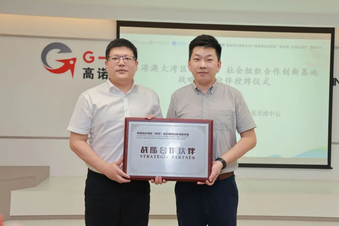 广州市民政局社会组织登记发展处副处长、南沙区民政局副局长印锐为广州市南沙区粤港澳大湾区文化交流中心授粤港澳大湾区(南沙)社会组织合作创新基地战略合作伙伴牌匾。