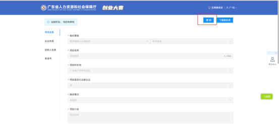 若报名信息被退回,登录后左上角会写明回退原因,如图,请参赛者查看退回原因并按回退意见修改完善后,再次提交。