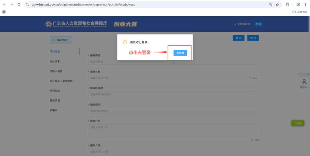 进入报名界面,点击【去登录】按钮,在用户登录界面进行注册或登录,如图所示: