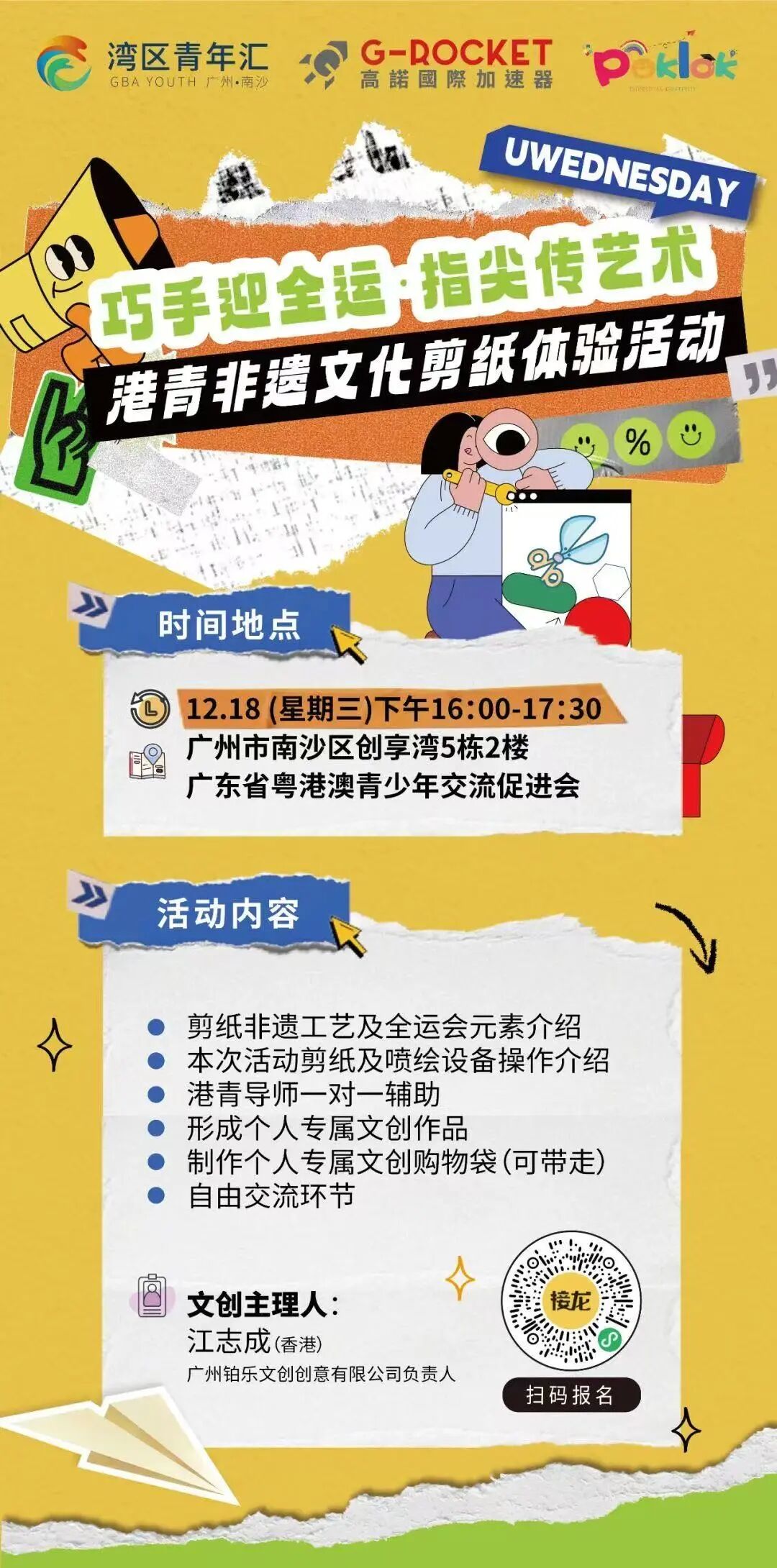 导读:“剪”出非遗之美!快来一起趣玩指尖上的“非遗”吧~ ⏰活动时间:2024年12月18日(星期三)16:00-17:30📍活动地点:广州市南沙区创享湾5栋2楼广东省粤港澳青少年交流促进会✂️参与方式: