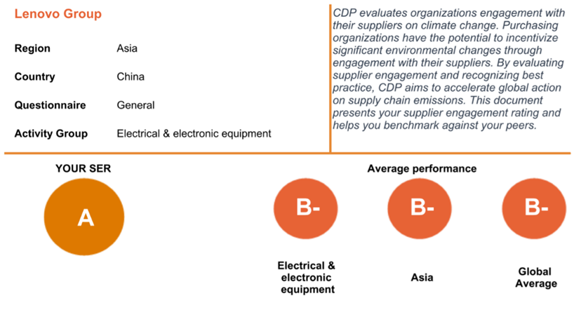 在此背景下,CDP日前发布《供应链参与:驱动速度与规模》报告(以下简称报告),并公布了2021年CDP供应商参与度评级(SER)及领袖榜单。其中,联想集团再次在该评级中获得最高级别——“A”级,远超全球、亚洲以及同行业平均水平B-,并与全球其他517家企业共同登上供应商合作评级领袖榜。
