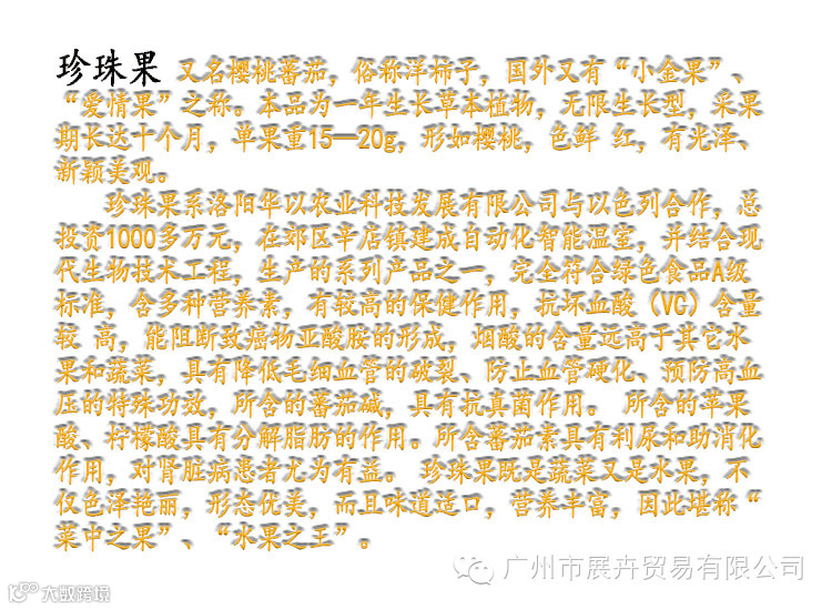 展卉全球供应链一个只属于传说中的水果,没错!这就是珍珠果《又称黄姑娘、小姑娘》。珍珠果新鲜采摘,新鲜空运,全球集中批发,全球冷链输送,品质有保证,价格更优惠。20年水果批发,这就是经验。广州展卉隆重推出的珍珠果,你就不想尝一下?来吧!让我们品尝人间的美味,为世界杯狂欢。亲!你还在犹豫吗?
