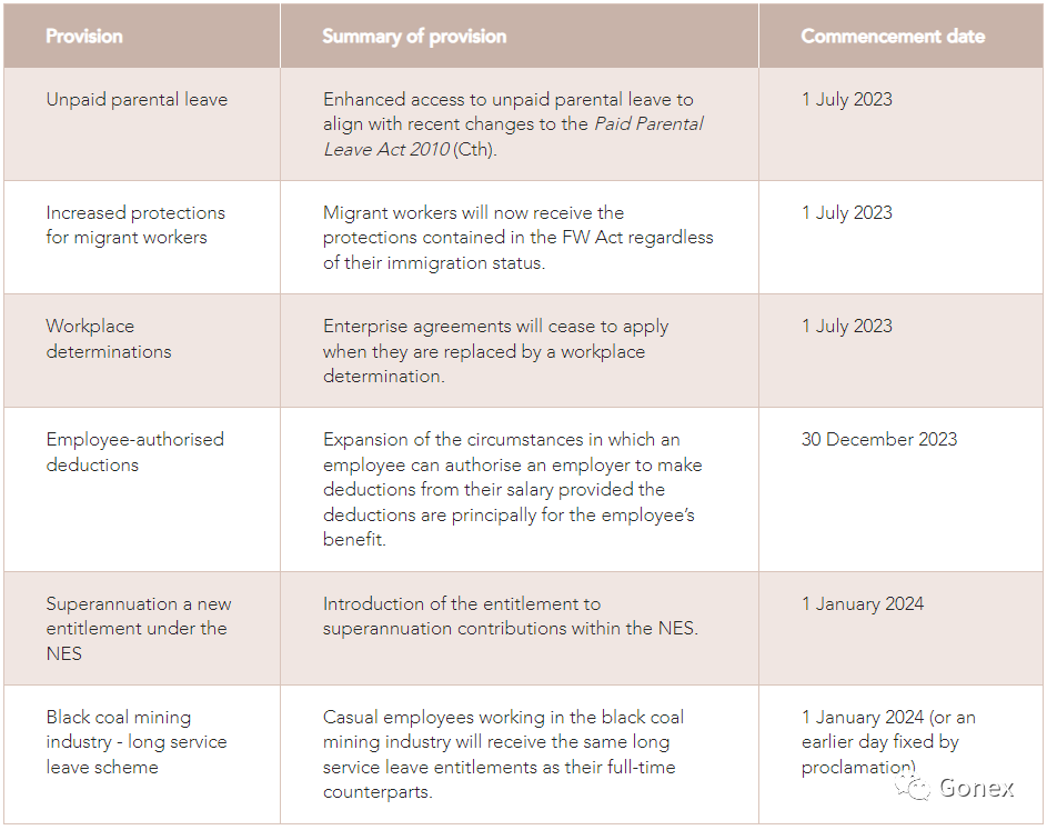 2023年6月30日,《2023年公平工作立法修正案(保护工人权利)法案》获得御批,成为法律(PWE法案)。PWE法案对《2009年公平工作法》(联邦法)及相关立法进行了几项关键修改,包括扩大无薪育儿假的覆盖面,在《国家就业标准》(NES)下引入养老金保障缴款作为一项新的权利,并加强对移民工人的保护。