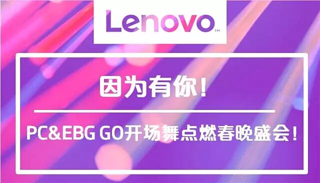 2016年联想春节联欢晚会在一片欢呼声中落下了帷幕,相信那绚丽的舞台,耀眼的灯光,引人入胜的节目还有柳总及元庆暖人的话语都已经深深地留在我们所有人心里。PC&EBG GO的开场舞《点燃青春》大气磅礴、激情似火,点燃了全场的热情,给大家留下了深刻的印象。